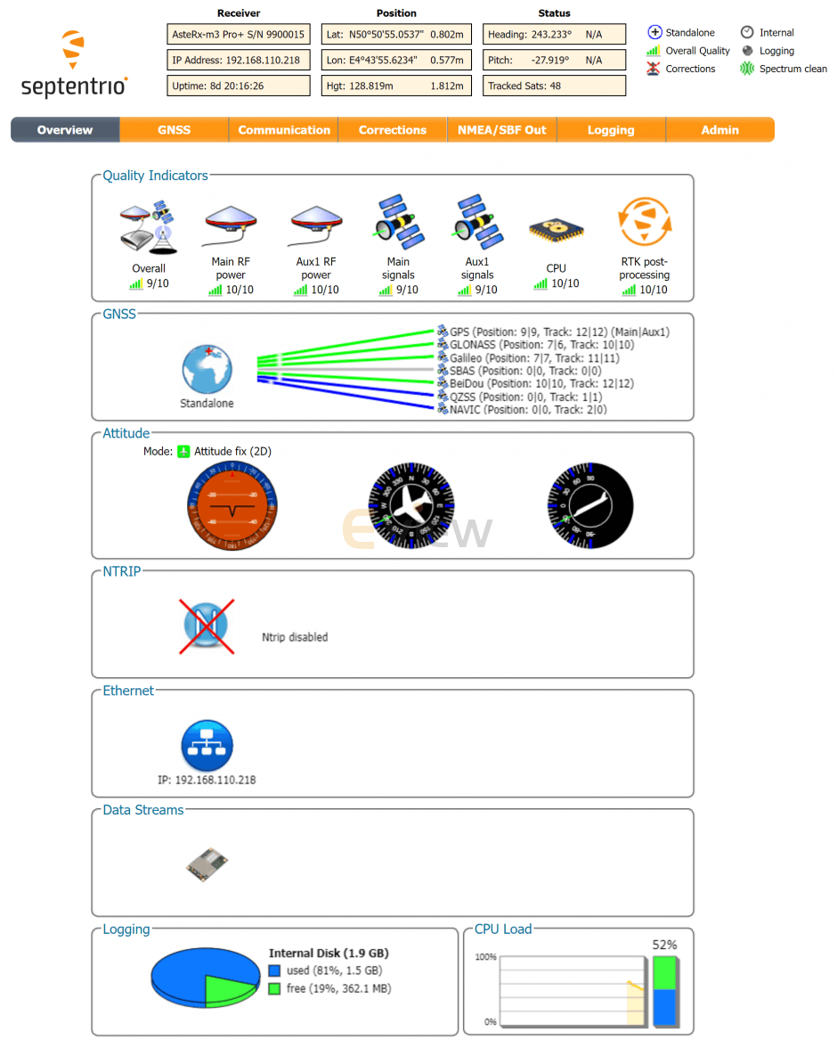 The receiver includes an intuitive web user interface for easy operation and monitoring allowing youto control the receiver from any mobile device or computer. The web interface also uses easy-to-read quality indicators ideal to monitor the receiver operation during the job at hand.