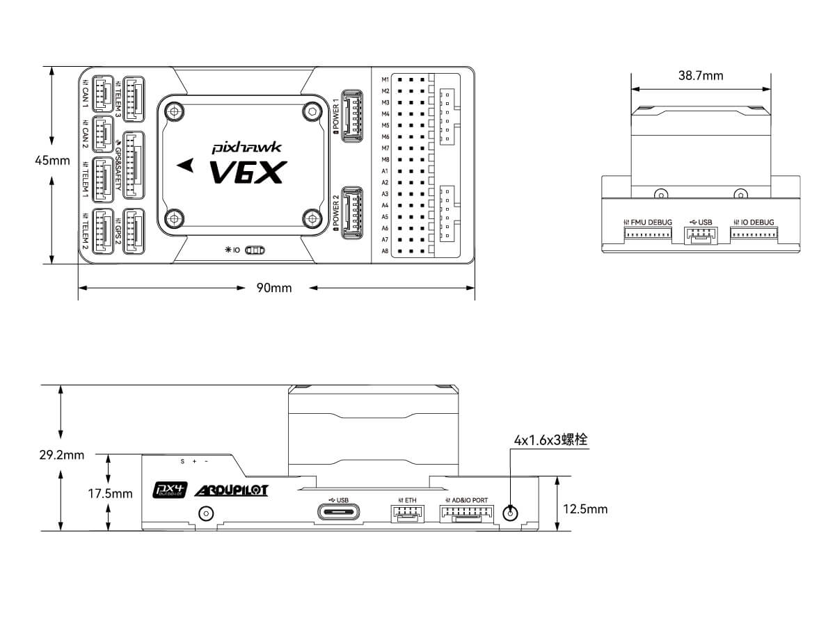 Using STM32H753IIK6 processor, double precision floating point arithmetic unit (DSP&FPU), the main frequency up to 480MHz; 2M FLASH,1MB RAM; For Autopilot to bring powerful computing power, rapid data processing ability, for more functional development and flight stability to provide more possibilities |