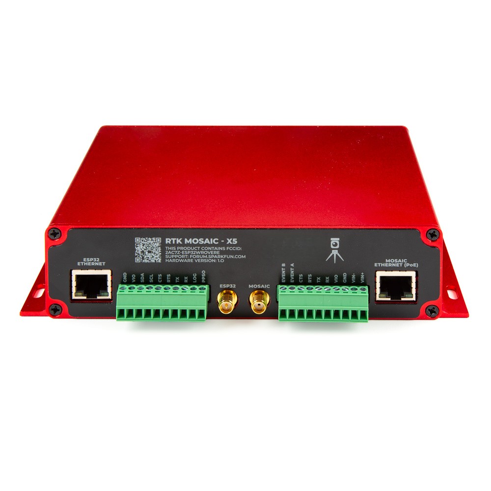 • The RTK Mosaic-X5 has multiple power options. Any or all of these can power it: mosaic X5 USB-C connection, ESP32 USB-C connection, Ethernet power supply (36V to 57V), or external DC power supply between 9V and 36V.