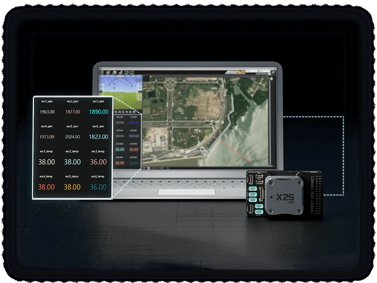 By connecting to intelligent battery and ESCs via CAN, X25 EVO can transmit status, operating temperature and device information of intelligent batteries, motors, ESCs, servos and other system devices, enabling status monitoring among unmanned system devices and enhancing system safety.